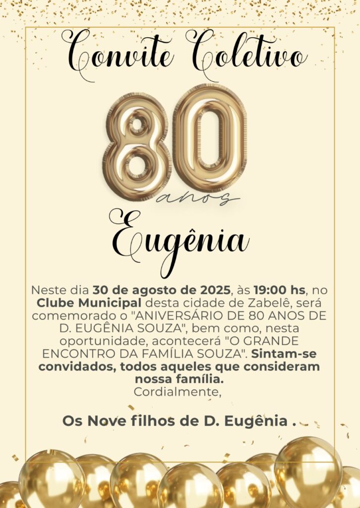 No próximo sábado, dia 30 de agosto de 2025, a cidade de Zabelê será palco de uma celebração especial e cheia de significado: o aniversário de 80 anos de Dona Eugênia Souza, uma figura muito querida da comunidade e matriarca de uma família numerosa e unida.